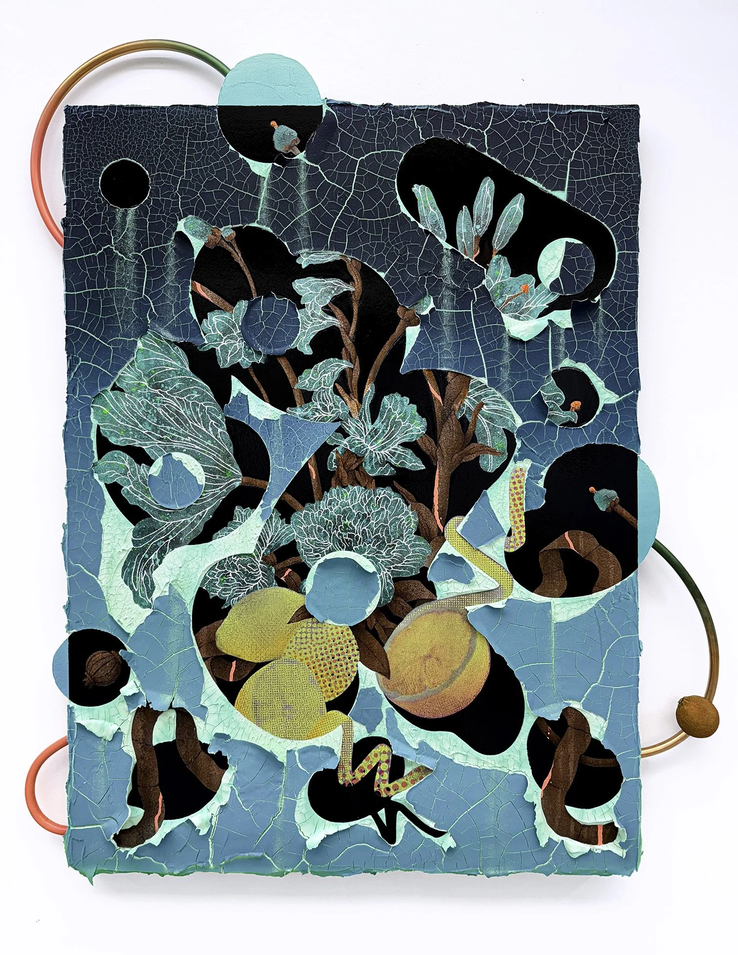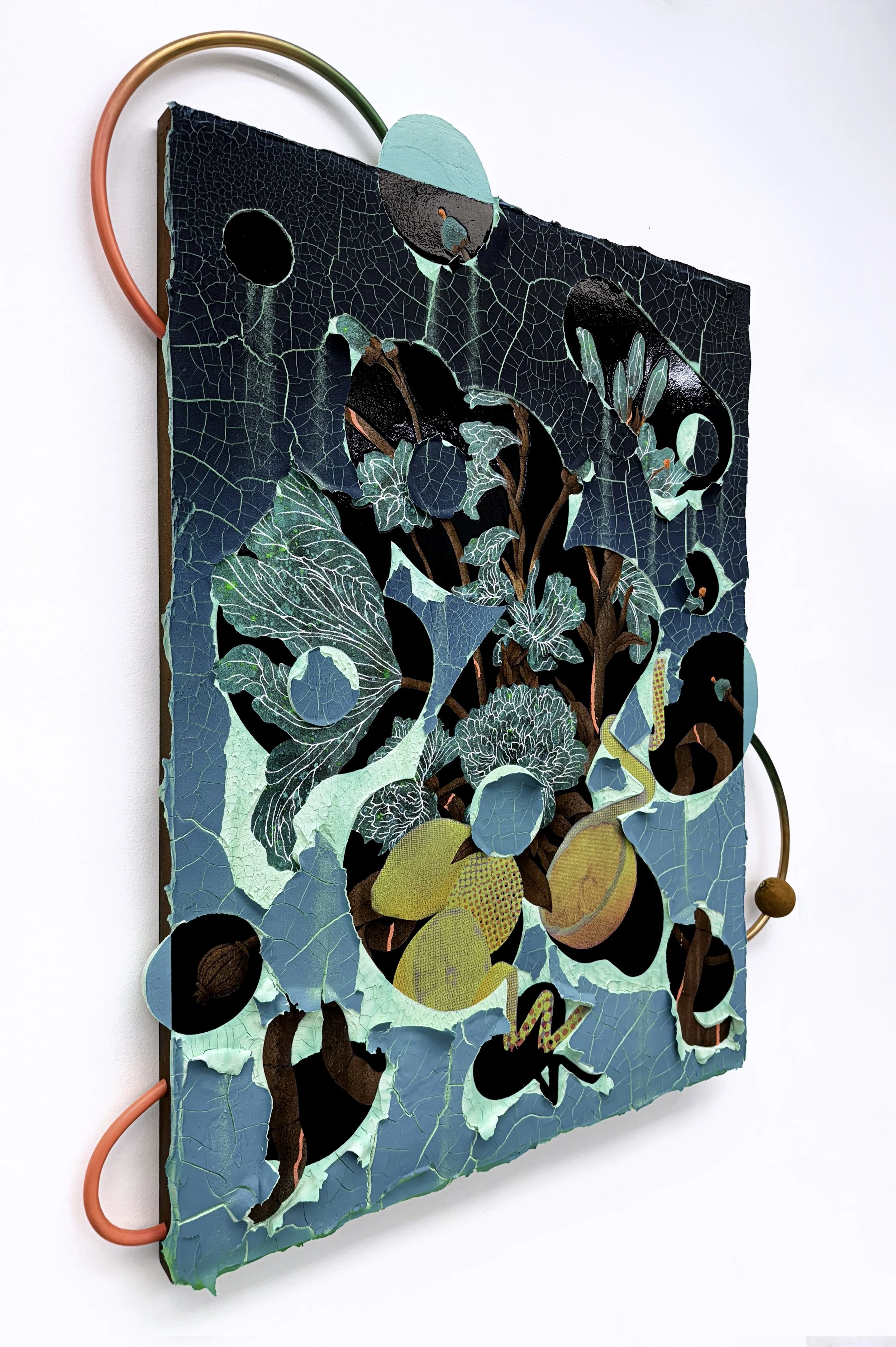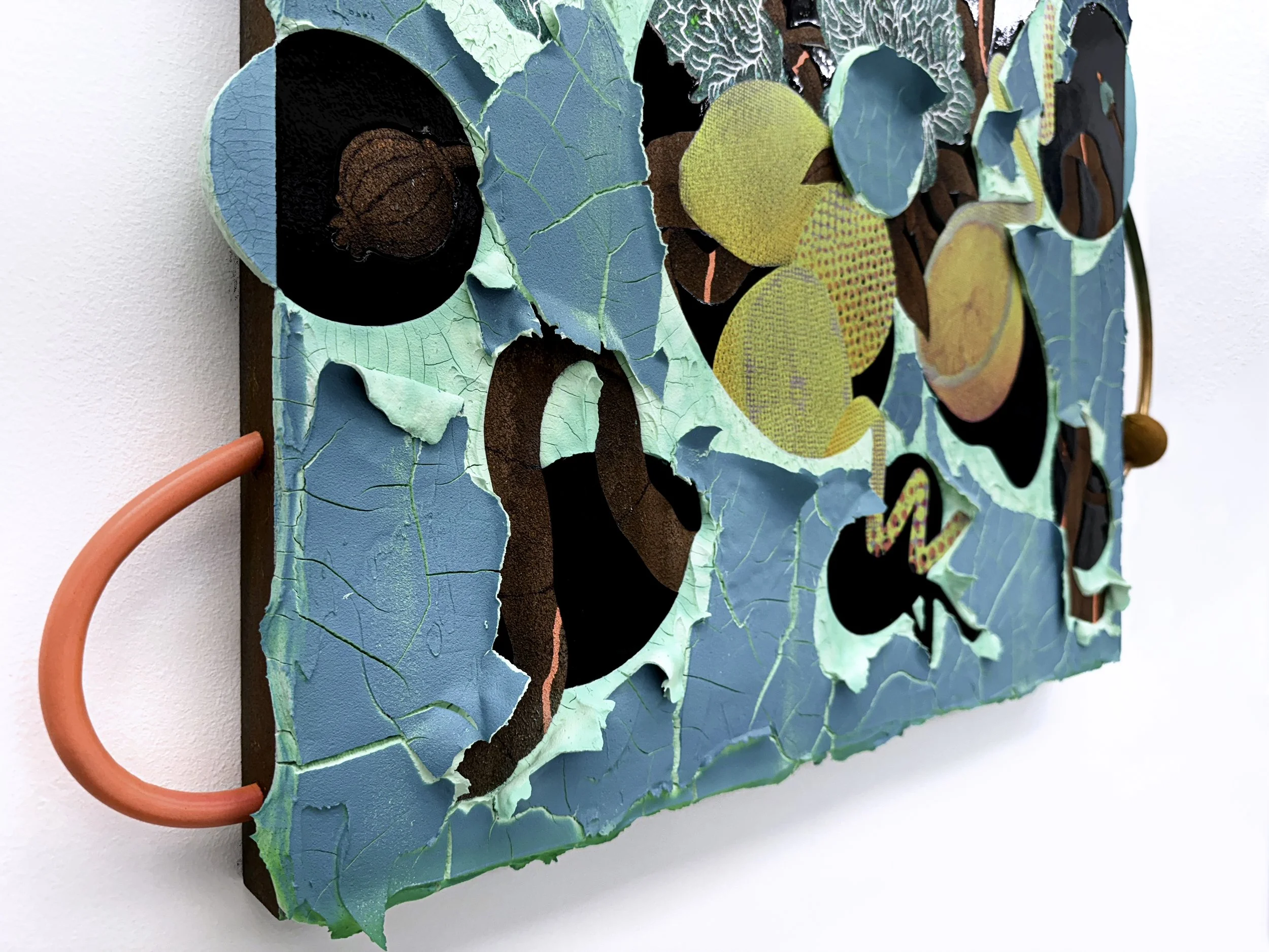 46"x37”, Acrylic & Kuricoat C-720(synthetic resin), CMYK screenprinting, powder pigment on panel, copper pipes, dehydrated orange